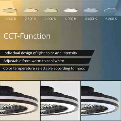Der Brilliant Palmero Ventilator Plastik Metall Schwarz 36W 5000lm - 827-865 CCT | 466mm - Fernsteuerung Dimmbar integriert sich unauffällig in verschiedene Einrichtungsstile – von urbanem Minimalismus bis zu klassischen Wohnwelten. Die sauberen Linien und die zurückhaltende Farbgestaltung machen ihn zu einer langlebigen Designlösung.