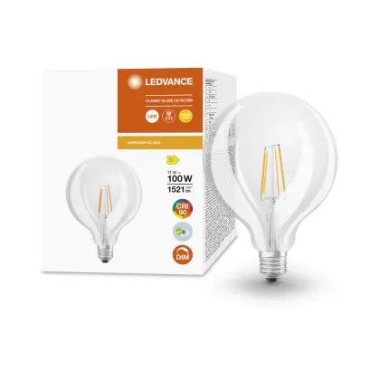 Die Ledvance Superior Classic LED E27 Globe Fadenlampe Klar 11W 1521lm - 927 Extra Warmweiß | Höchste Farbwiedergabe ist eine effiziente E27 LED-Lampe mit Retrodesign und der perfekte Ersatz für Ihre konventionellen 100W Lampen mit E27. Zudem strahlt sie Licht in der Farbtemperatur 2700K - Extra Warmweiß aus und punktet durch eine lange Lebensdauer.