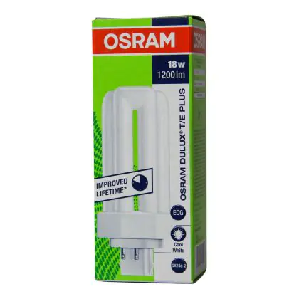 Osram Dulux T/E sind Kompaktleuchtstofflampen, die mit einem elektronischen Vorschaltgerät betrieben werden. Sie haben einen geringen Stromverbrauch und sind daher sehr effizient. Aufgrund ihres GX24q-2 Sockels sind Osram DULUX T/E 18W/840 PLUS GX24q-2 Lumilux Cool White leicht in die Leuchten zu installieren. Die Lampen haben eine sehr lange Lebensdauer von durchschnittlich 13.000 Stunden!