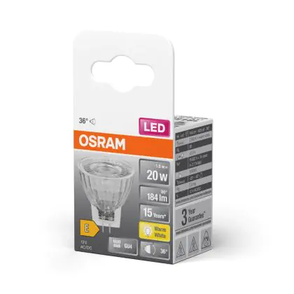 Aufgrund moderner LED-Technologie verbraucht der GU4 LED-Strahler von Osram besonders wenig Strom, seine Wattzahl ist somit deutlich niedriger als bei konventionellen Halogenstrahlern. Sein Verbrauch: 2.5 Watt. Trotzdem bleibt die Lichtleistung, also der Lumen-Wert, gleich. Somit kann er eine besonders hohe Lumeneffizienz von lm/W aufweisen. Das wirkt sich besonders positiv auf Ihre Stromrechnung aus, da Sie mit diesem Produkt wesentlich weniger Energie benötigen, um die Helligkeit zu bekommen, die Sie benötigen.