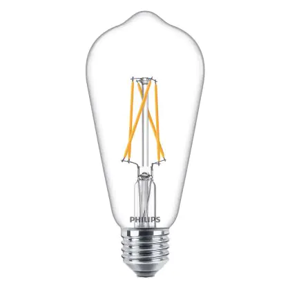 Die Philips Classic LEDbulb E27 Edison 8.5W 827 Klar ist eine LED-Lampe mit einem gängigen E27-Sockel. Sie zeichnet sich durch eine hohe Effizienz aus und ermöglicht Energieeinsparungen von ca. 85 %. Sie hat eine Farbtemperatur von 2.700 K (extra Warmweiß) und eine lange Lebensdauer von 5 Jahren. Die Filamente im Lampen-Inneren sorgen für einen schönen Look mit Vintage-Charme. Darüber hinaus besitzt die Lampe eine Edison-Form, die an Glühbirnen-Zeiten erinnert. Die Classic-LED ist dimmbar über DimTone und verändert damit nicht nur ihre Helligkeit, sondern auch die Farbtemperatur.